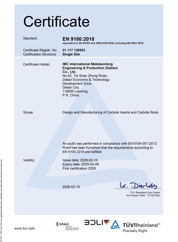 IMC Dalian has achieved full compliance with AS9100; quality management system standard for manufacturing and servicing of aerospace components from SII (The Standard Institution of Israel).